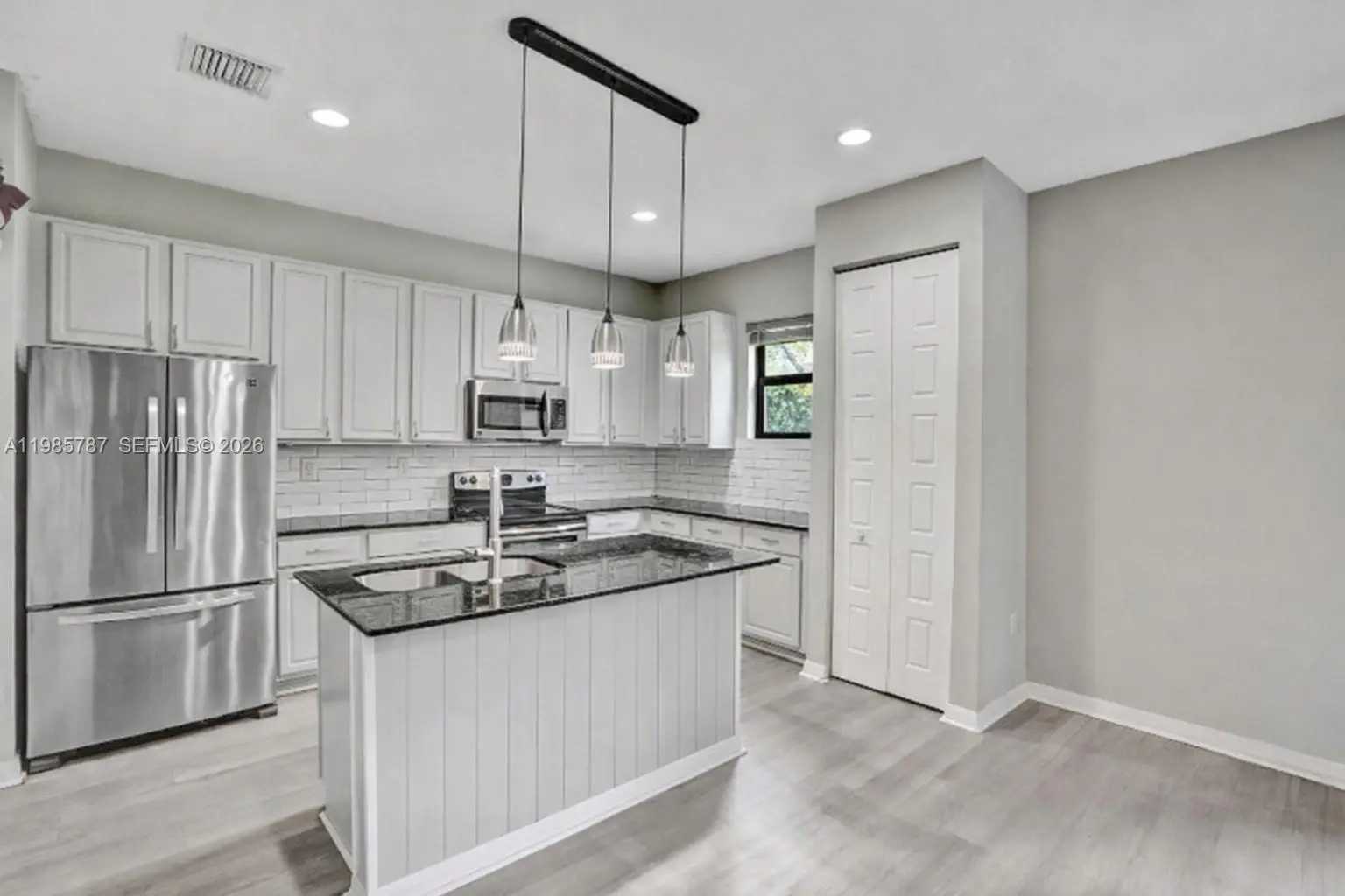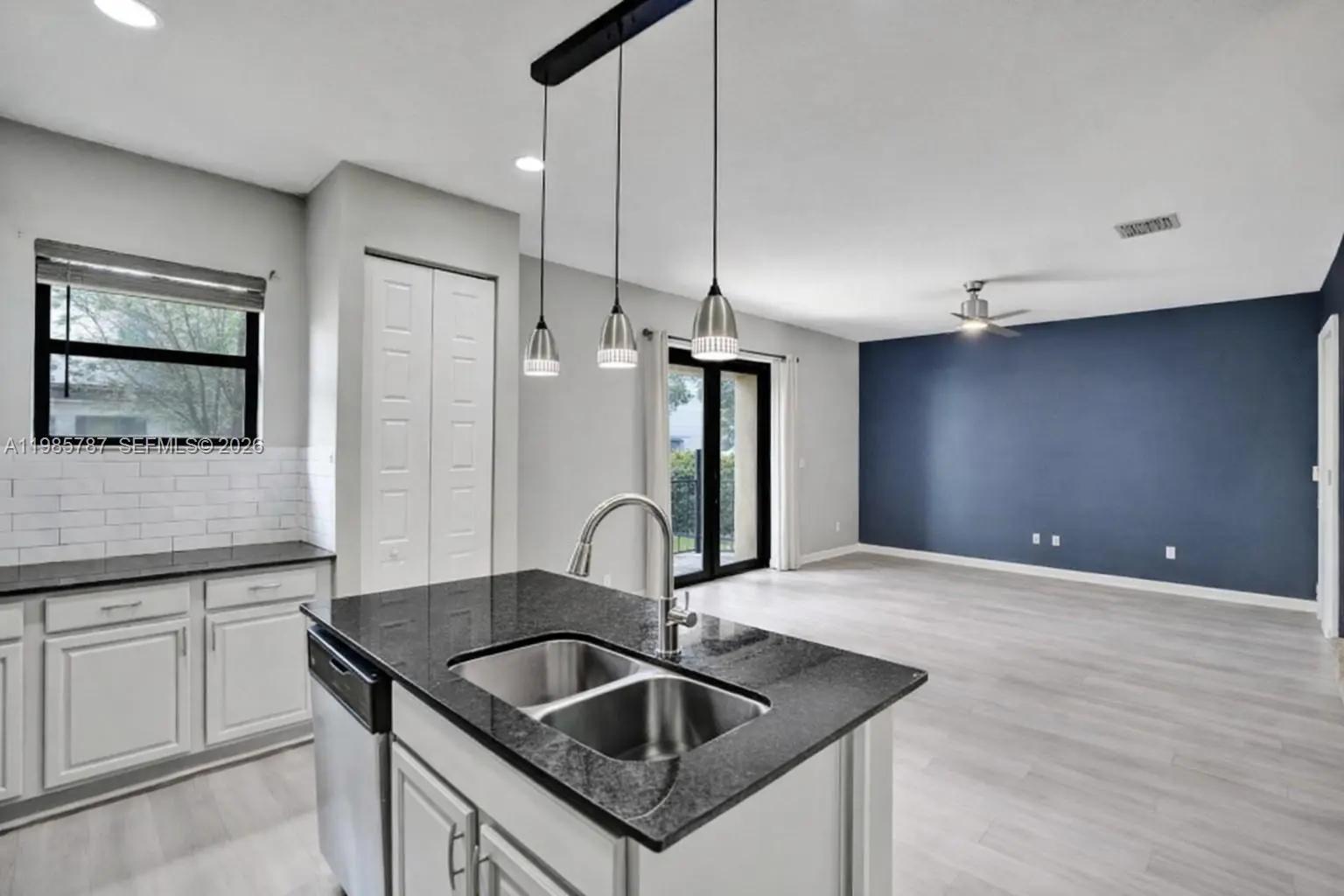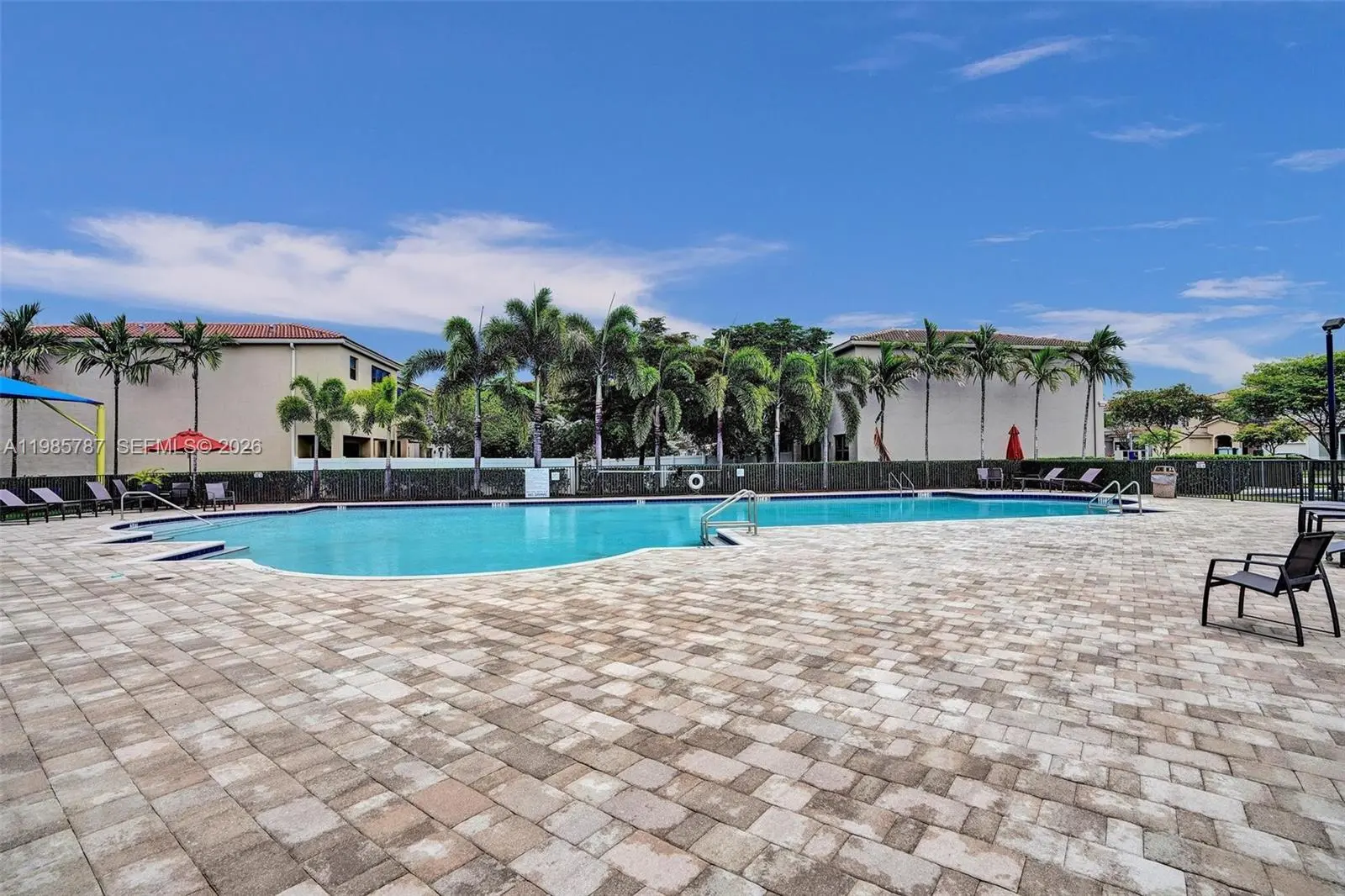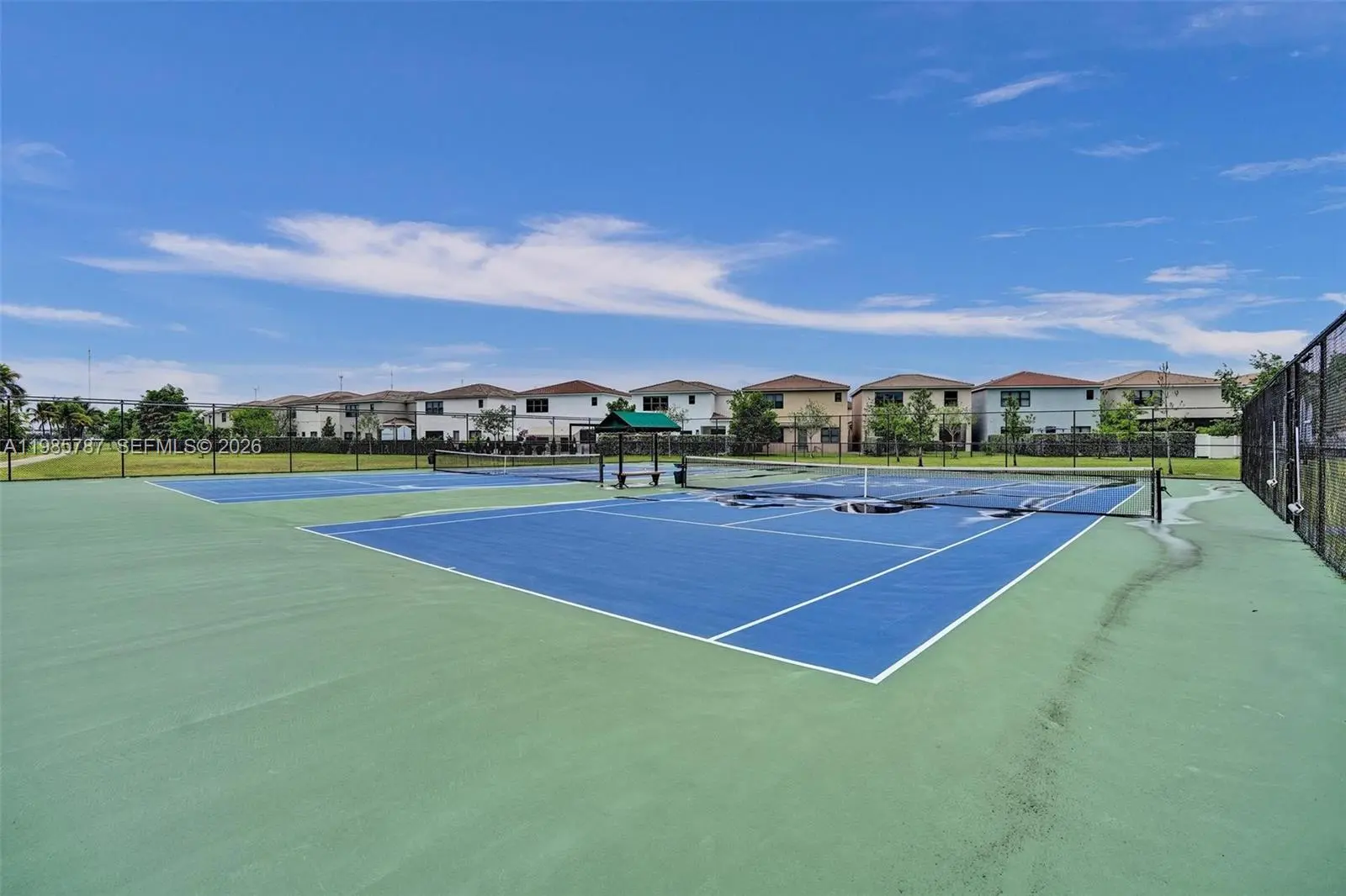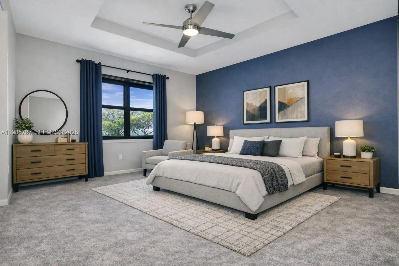 Live with peace of mind in a suburban neighborhood featuring lush landscaping and 24-hour security patrol. Spacious living and dining areas. Modern kitchen with breakfast area, stainless steel appliances, and a granite island with built-in sink. Cozy media room with flat-screen TV, soundbar, comfortable sofa, and abundant natural light. Private outdoor patio with barbecue area. New wall-to-wall carpet on the staircase and in all bedrooms. Ceiling fans ready for Google Home integration. The primary bedroom features a king-size bed. Primary bathroom with dual sinks and ample cabinetry. All bedrooms offer large closets and natural light. Community amenities include a swimming pool, tennis courts, and a covered playground.