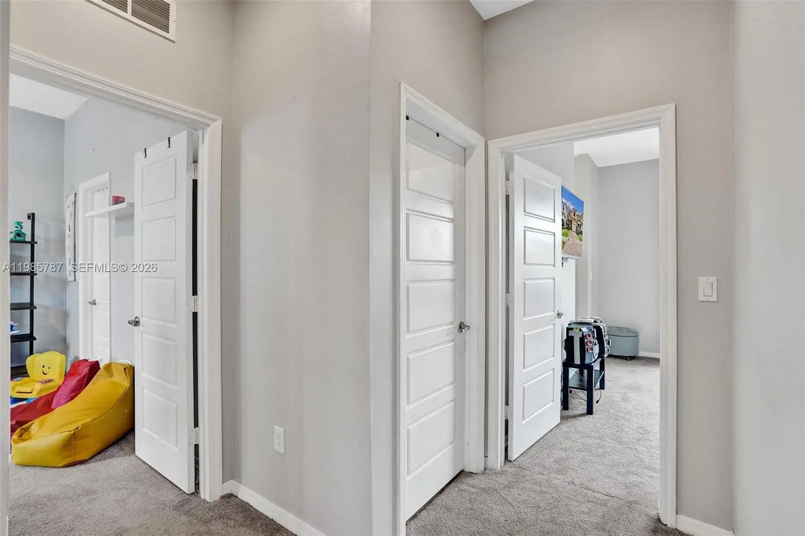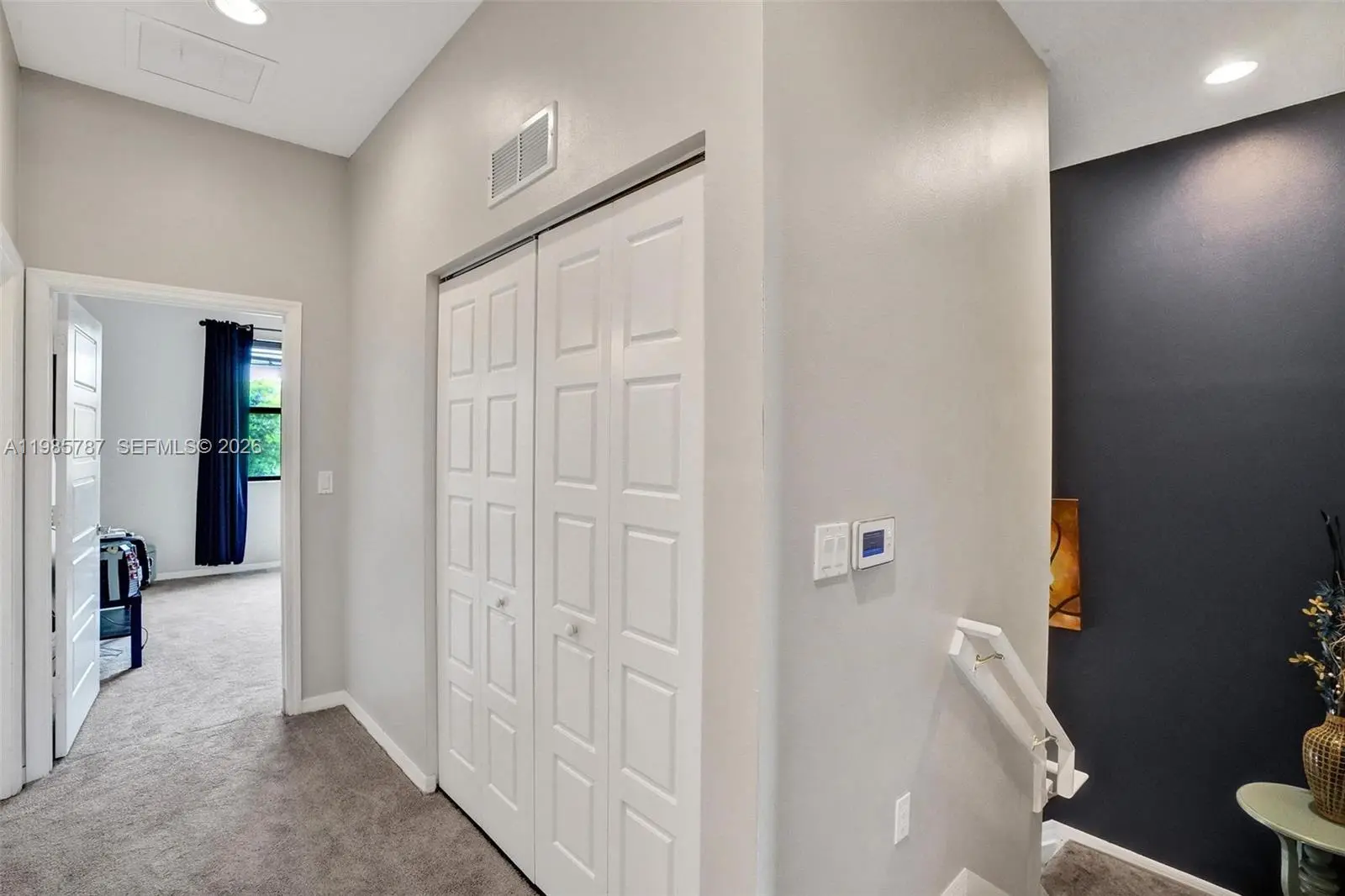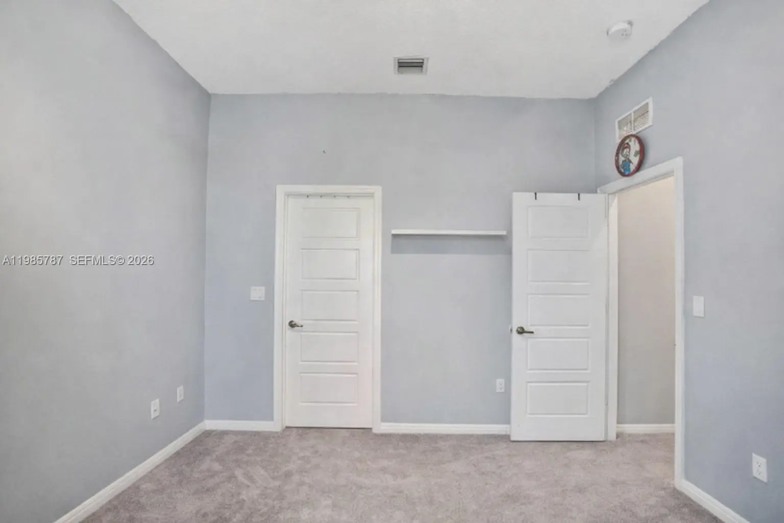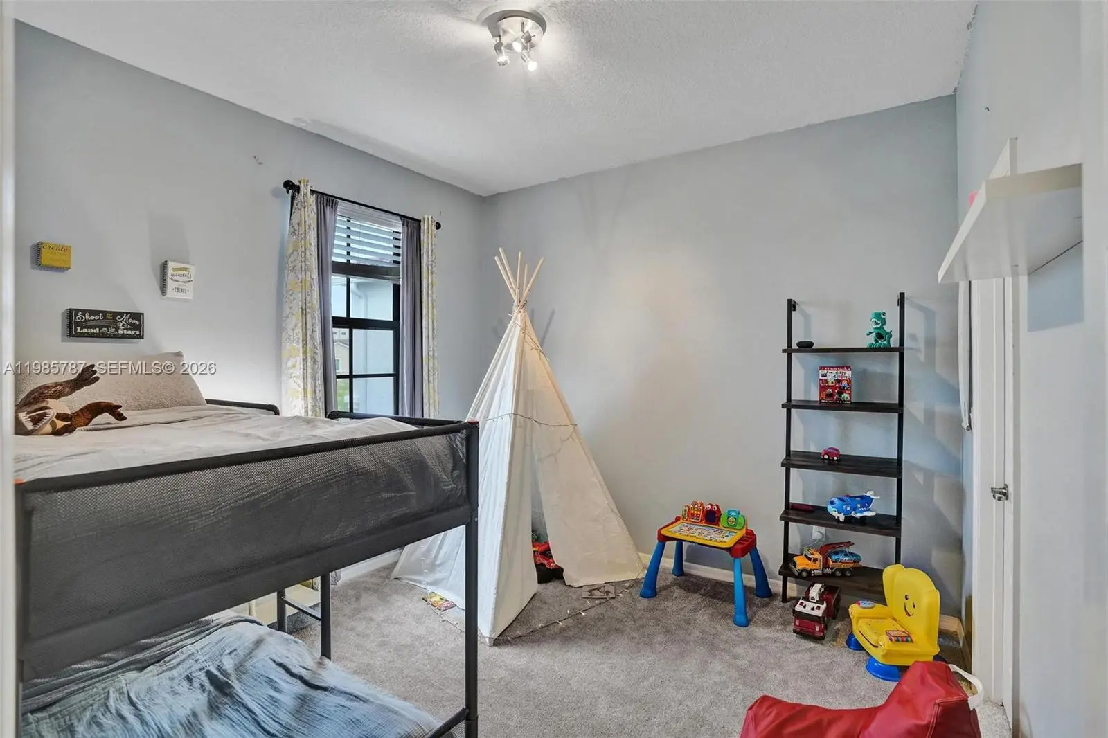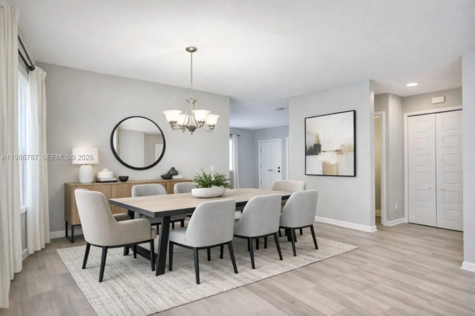 Live with peace of mind in a suburban neighborhood featuring lush landscaping and 24-hour security patrol. Spacious living and dining areas. Modern kitchen with breakfast area, stainless steel appliances, and a granite island with built-in sink. Cozy media room with flat-screen TV, soundbar, comfortable sofa, and abundant natural light. Private outdoor patio with barbecue area. New wall-to-wall carpet on the staircase and in all bedrooms. Ceiling fans ready for Google Home integration. The primary bedroom features a king-size bed. Primary bathroom with dual sinks and ample cabinetry. All bedrooms offer large closets and natural light. Community amenities include a swimming pool, tennis courts, and a covered playground.