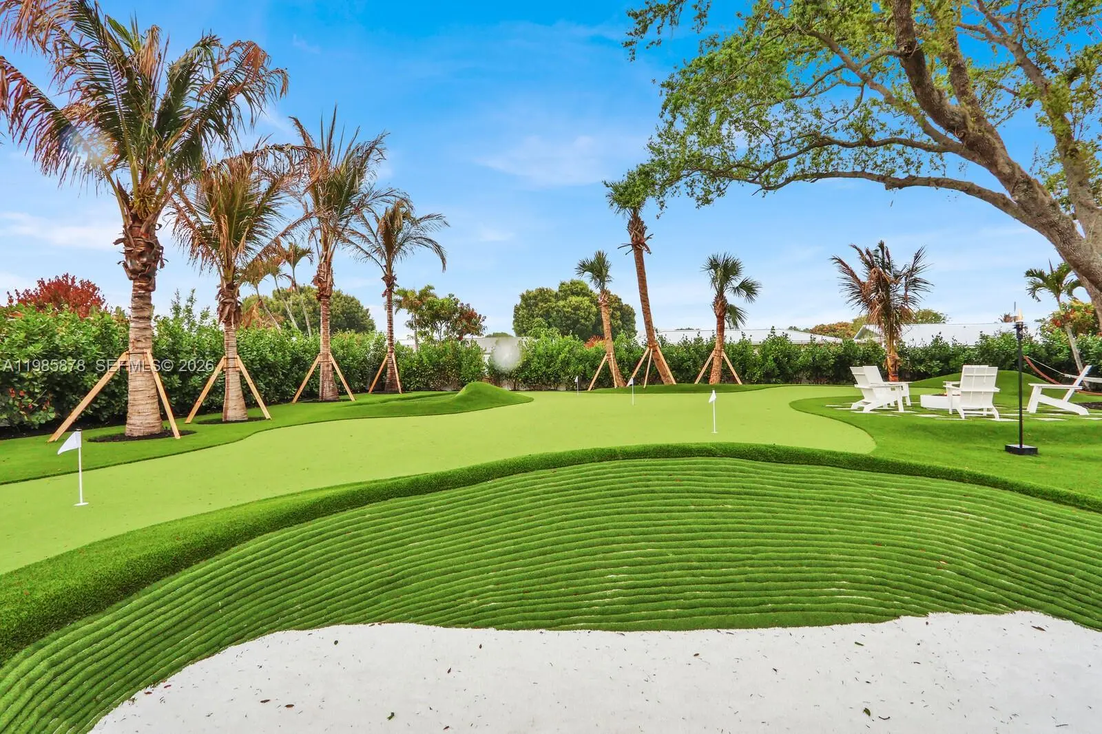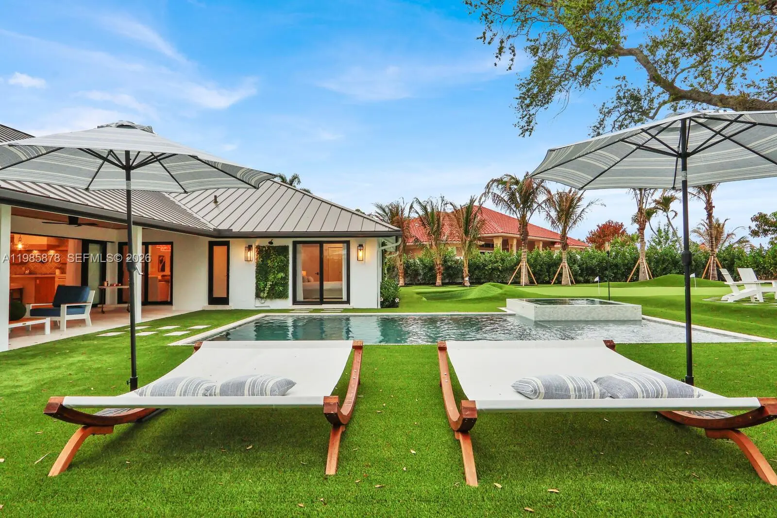 Interior designer completely rebuilt and re-imagined luxury modern coastal residence on a rare half acre lot beneath mature live oaks. Resort-style backyard is one of a kind, showcasing a century-old oak tree, a custom brand new heated pool/spa, summer kitchen with DSC grill, Zephyr hood, and lanai overlooking a professional grade putting/chipping green anchored by two Scottish-style revetted bunkers. Wonderful, thoughtfully designed open floor plan with high end finishes - Subzero/Wolf chef's kitchen, gorgeous wide plank white oak porcelain floors from Portugal, PGT impact windows/doors, and more. The primary suite offers a tranquil retreat with a spa-inspired bath and fully customized walk-in closets. Gated Turtle Creek golf community (membership optional). Unparalleled privacy in a golf setting. Minutes to Jupiter beaches, golf clubs, and waterfront dining. Enjoy peaceful evenings by the fire pit, relax in the hammock or unwind on the swings beneath the magnificent oak tree. This luxury home is all about peace, tranquility, privacy, and entertaining your friends. Move in ready (can be purchased turnkey furnished).
