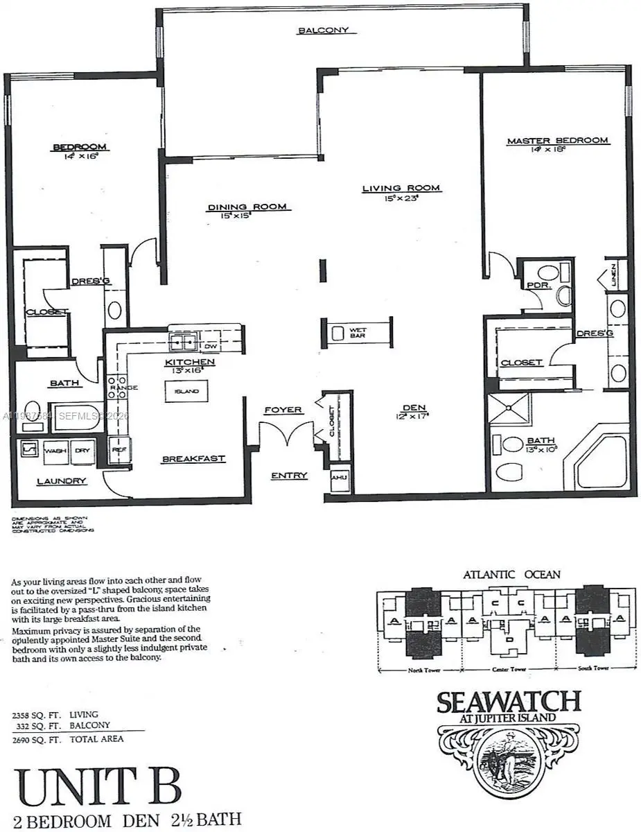 Extremely desirable and "hard to find B-unit" offering 2358 A/C....2670 total Sq.Ft. This lovely split 2Br/2.5BA plus den floor plan. Offers a wide-open breathtaking Turquoise Intracoastal view with a massive balcony ideal for entertaining. Great boat viewing & spectacular sunsets! Seawatch is a multi-amenity building offering 5 acres of common land, along with 24 hr. manned security, on site building manger, 2 car garage parking (74 & 120 upper level), & bike storage room. Building also has built in car wash. Additional features include on floor A/C owner storage room. All sizes, taxes, Hoa fees, & measurements approx.
