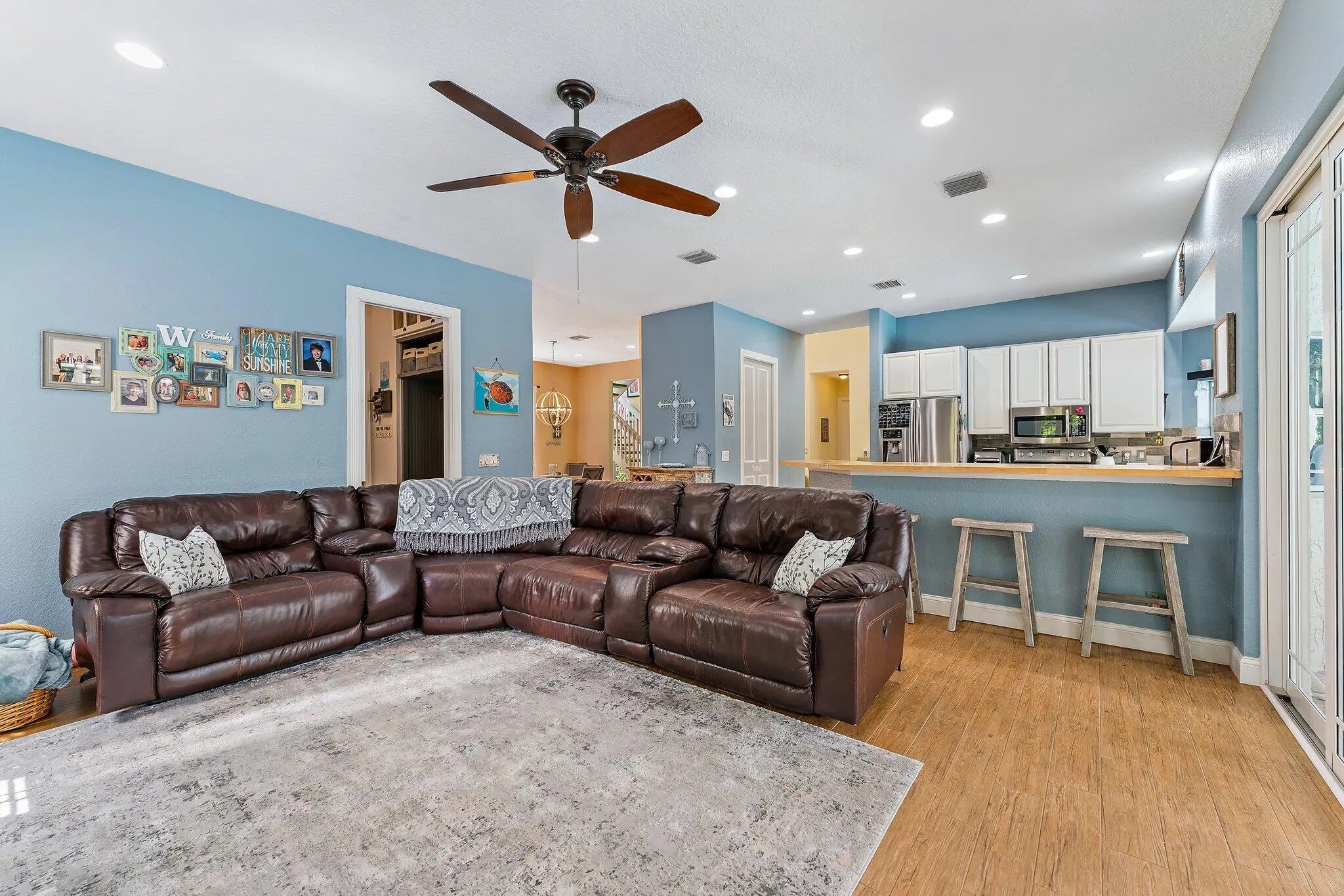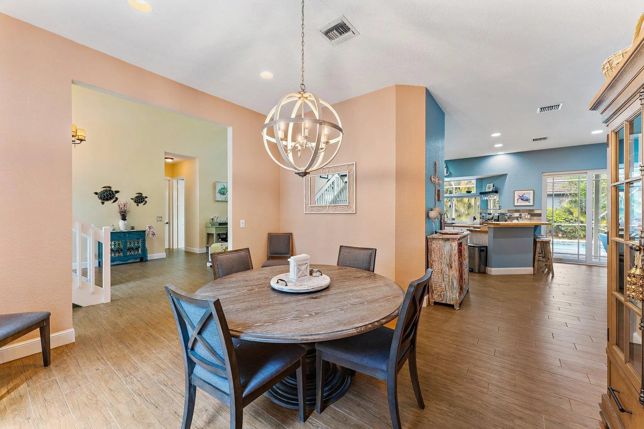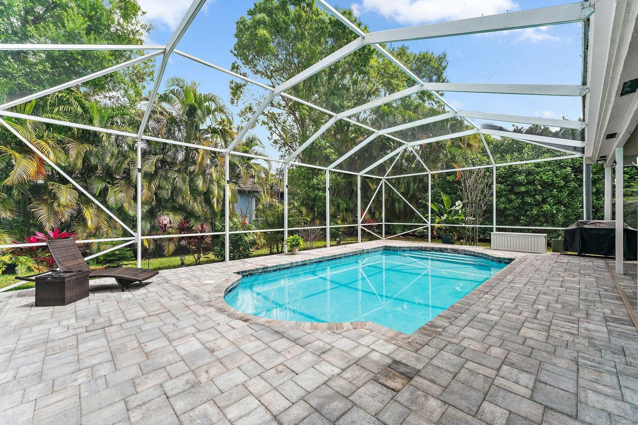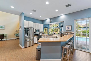 Tucked near the end of a cul-de-sac and surrounded by lush, mature landscaping, this beautifully maintained 3-bedroom, 3-bathroom home offers exceptional privacy and a thoughtfully designed layout. Welcome to The Moorings of Jupiter! The open-concept living spaces are filled with natural light and flow seamlessly to a large screened-in pool perfect for entertaining or enjoying relaxed weekends at home. The primary suite is conveniently located on the first floor and features plantation shutters, a spacious walk-in closet and a spa-like bathroom with a separate shower accented by a mosaic tile and a soaking tub. The main level showcases porcelain tile throughout, coastal backsplash in the kitchen, impact sliders, accordion hurricane shutters, outdoor lighting, a hurricane-rated garage door and one newer AC unit. Upstairs, you'll find two generously sized bedrooms, a fully remodeled bathroom and a versatile loft area. The second floor also offers direct access to a private deck overlooking the backyard and pool. Meticulously renovated and lovingly cared for, this home truly must be seen to be appreciated. Ideally located minutes from beaches, dining, shopping and top-rated schools, this inviting retreat delivers everyday convenience alongside serene privacy.