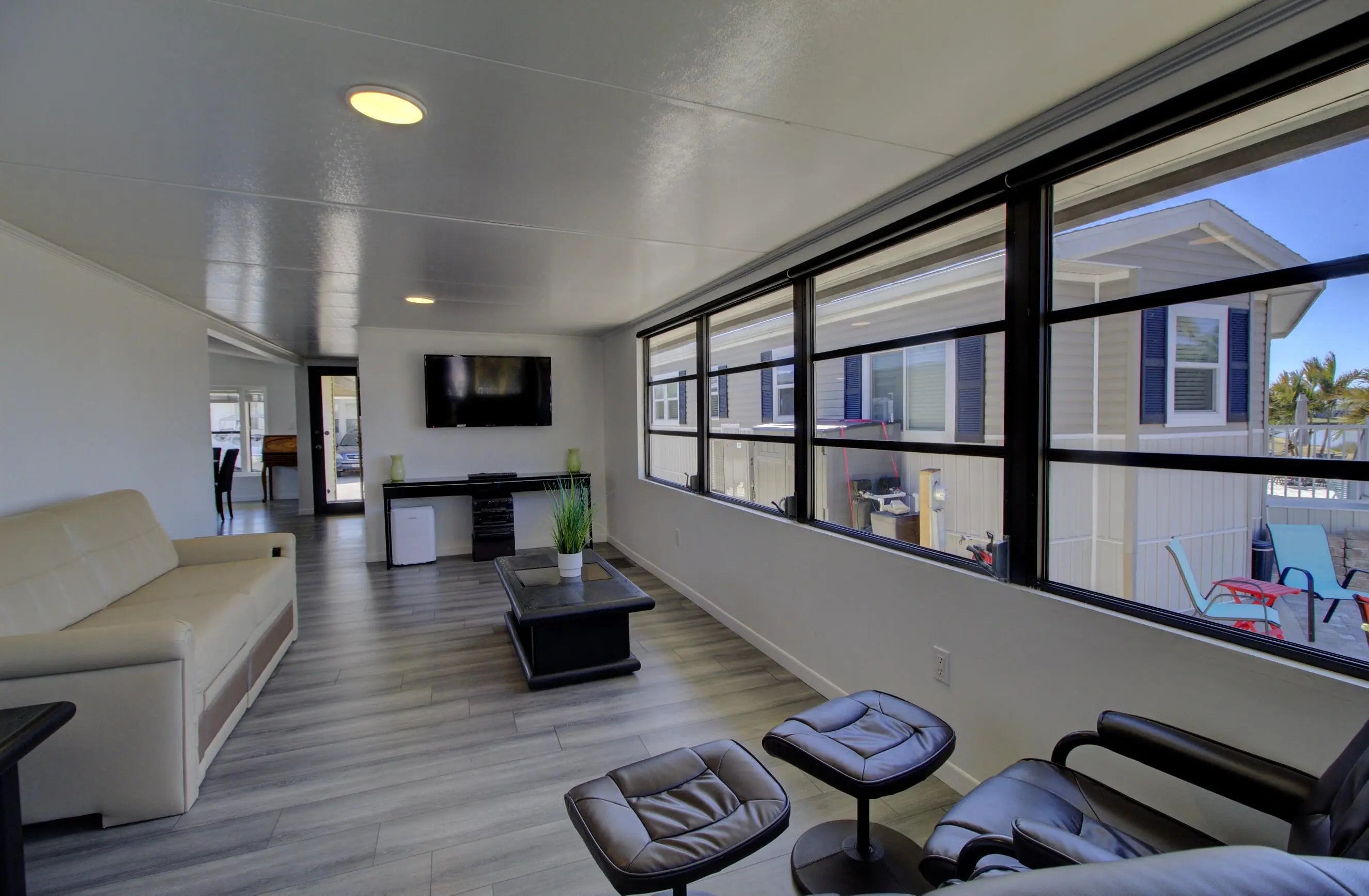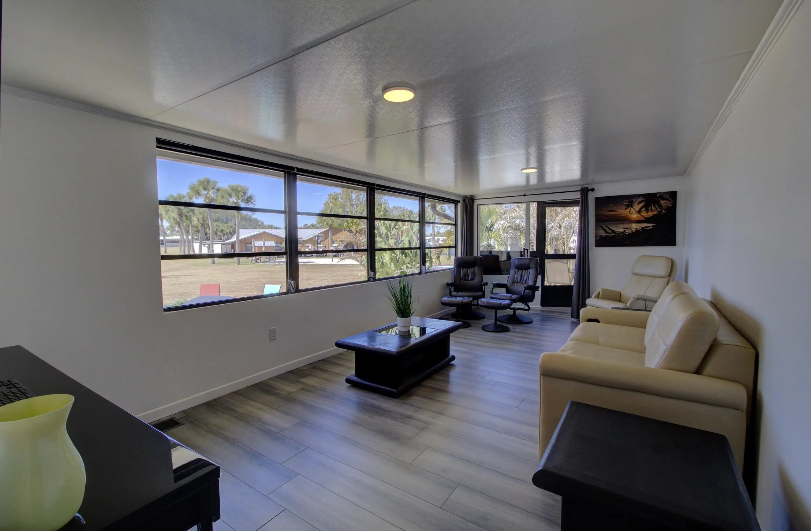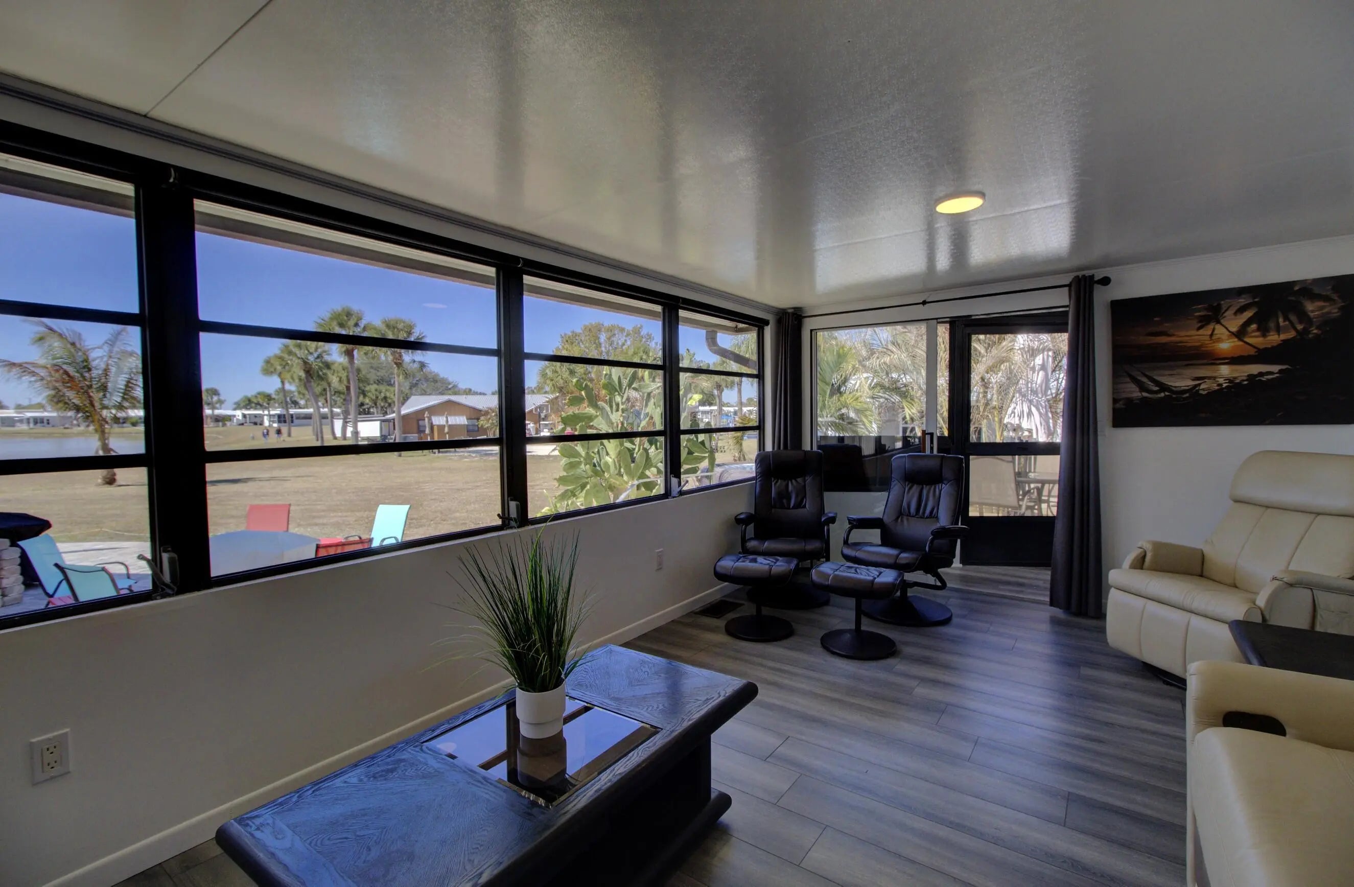 Water view living in the gated 55+ Ancient Oaks! This well-maintained 1989 home sits on owned land and offers breathtaking sunset views. Inside features 2 spacious bedrooms, 2 full baths, and an open floor plan filled with natural light and beautiful modern design. Updates include remodeled kitchen, new flooing, improved insulation, vapor barrier, and drywall throughout. Relax on the large lakeside terrace, screened porch, or covered front porch. Sold furnished with multiple TVs and major appliances. Outside storage and more. Active community offers pool, spa, clubhouse, marina with access to Lake Okeechobee, and more. Call today for more details and to schedule a tour