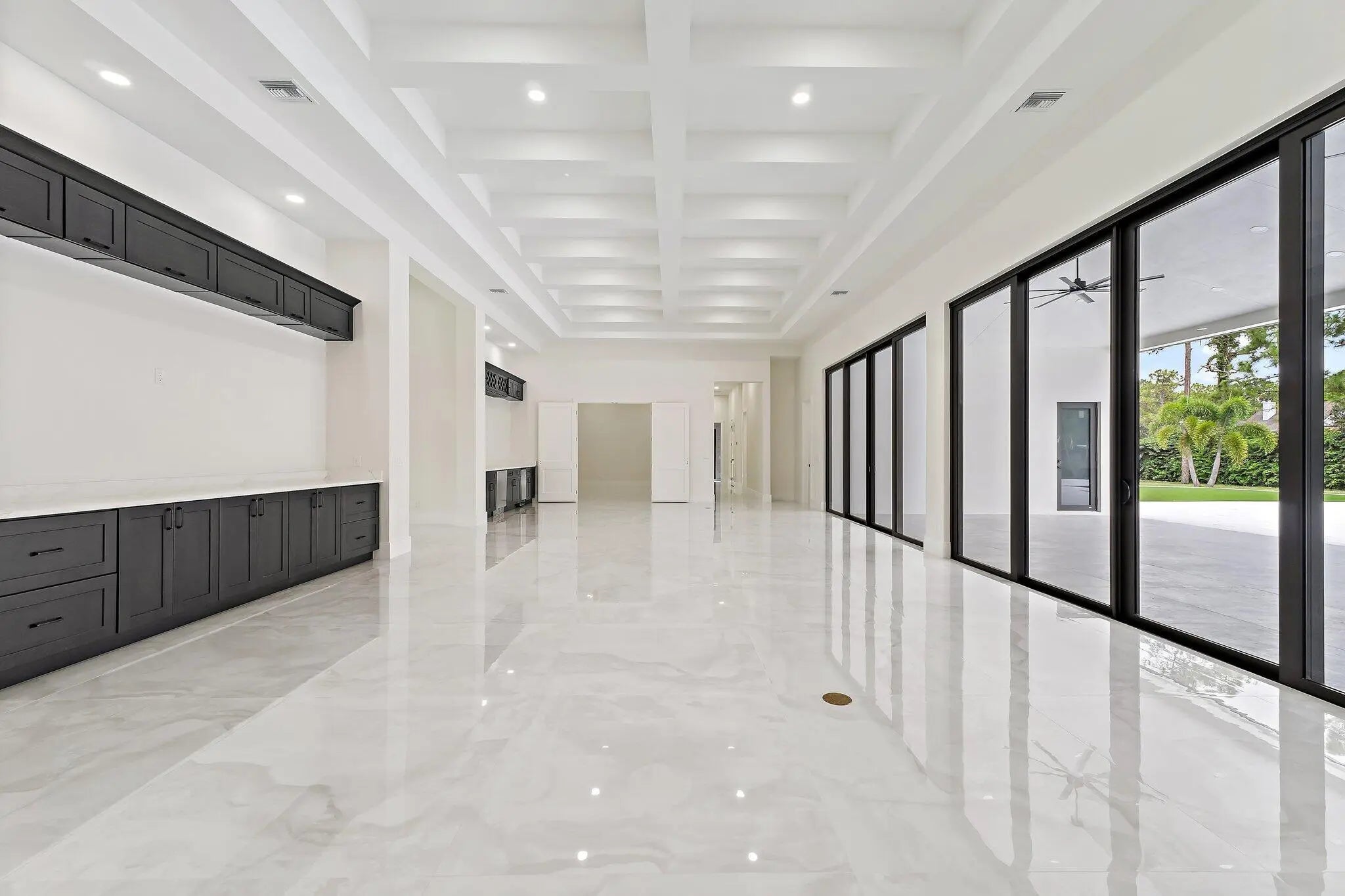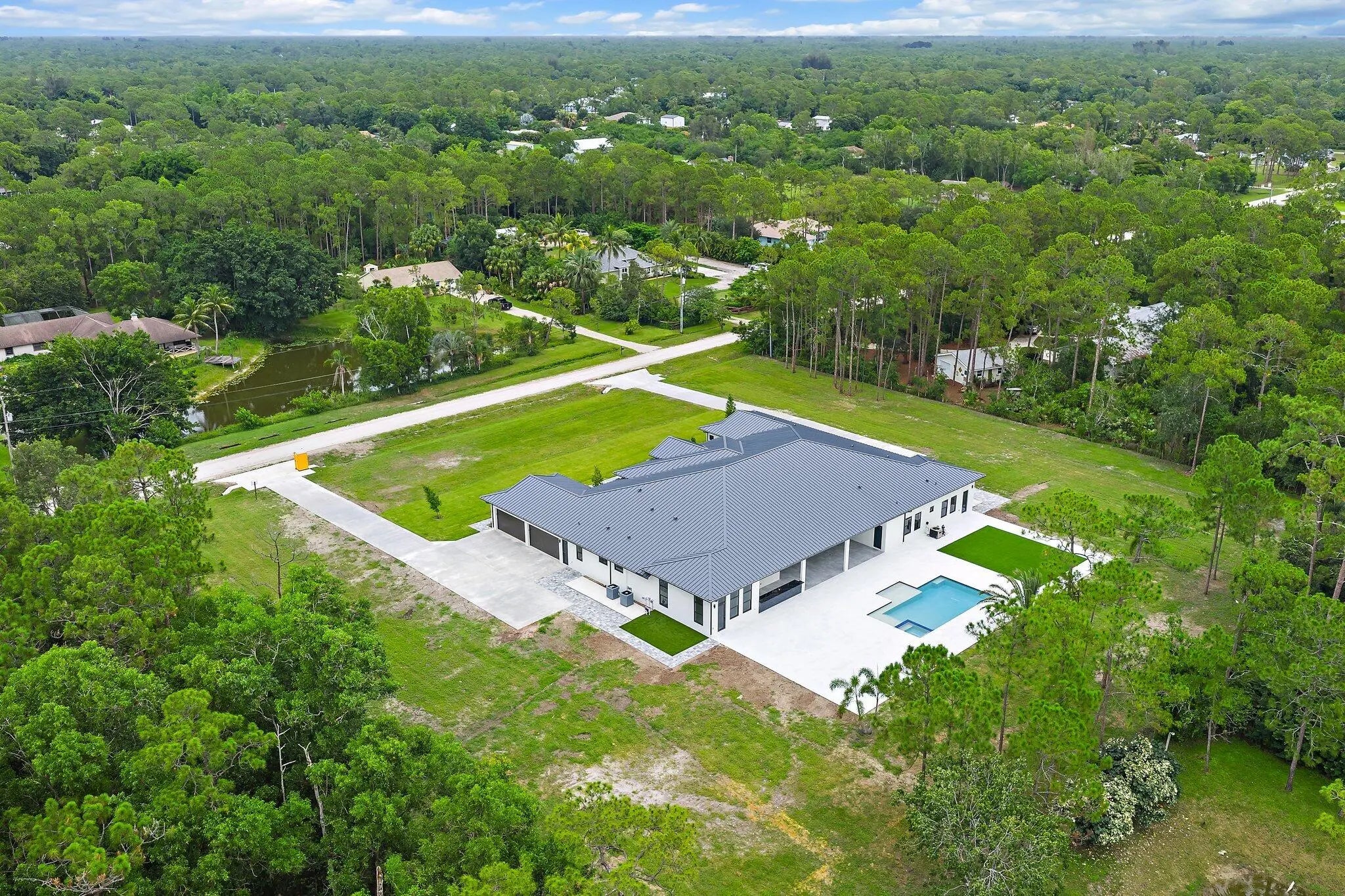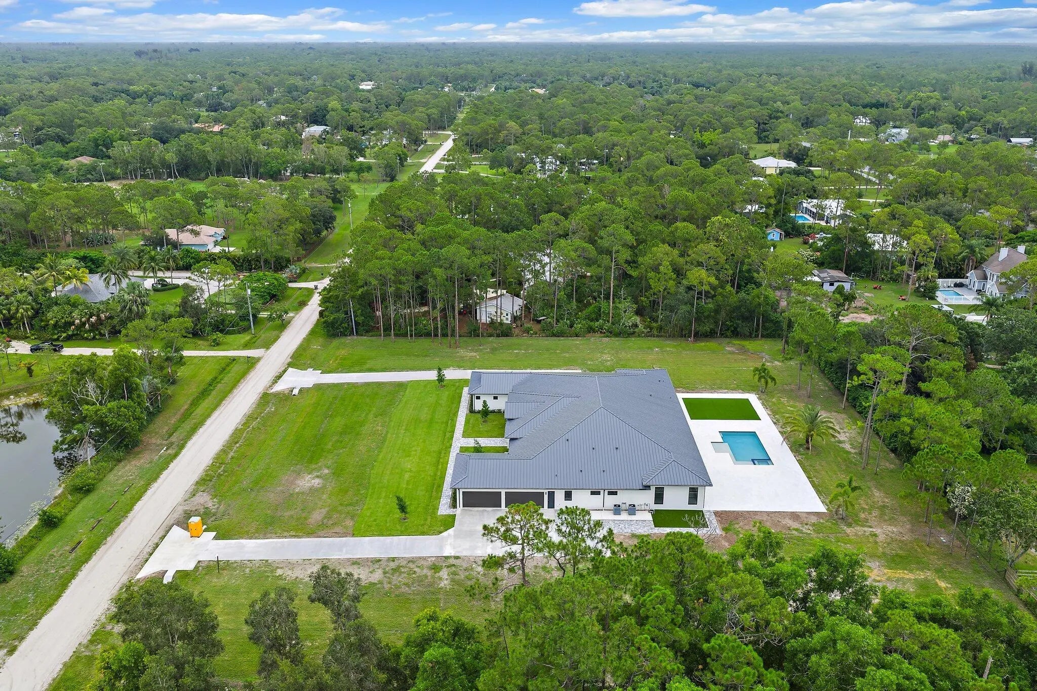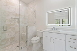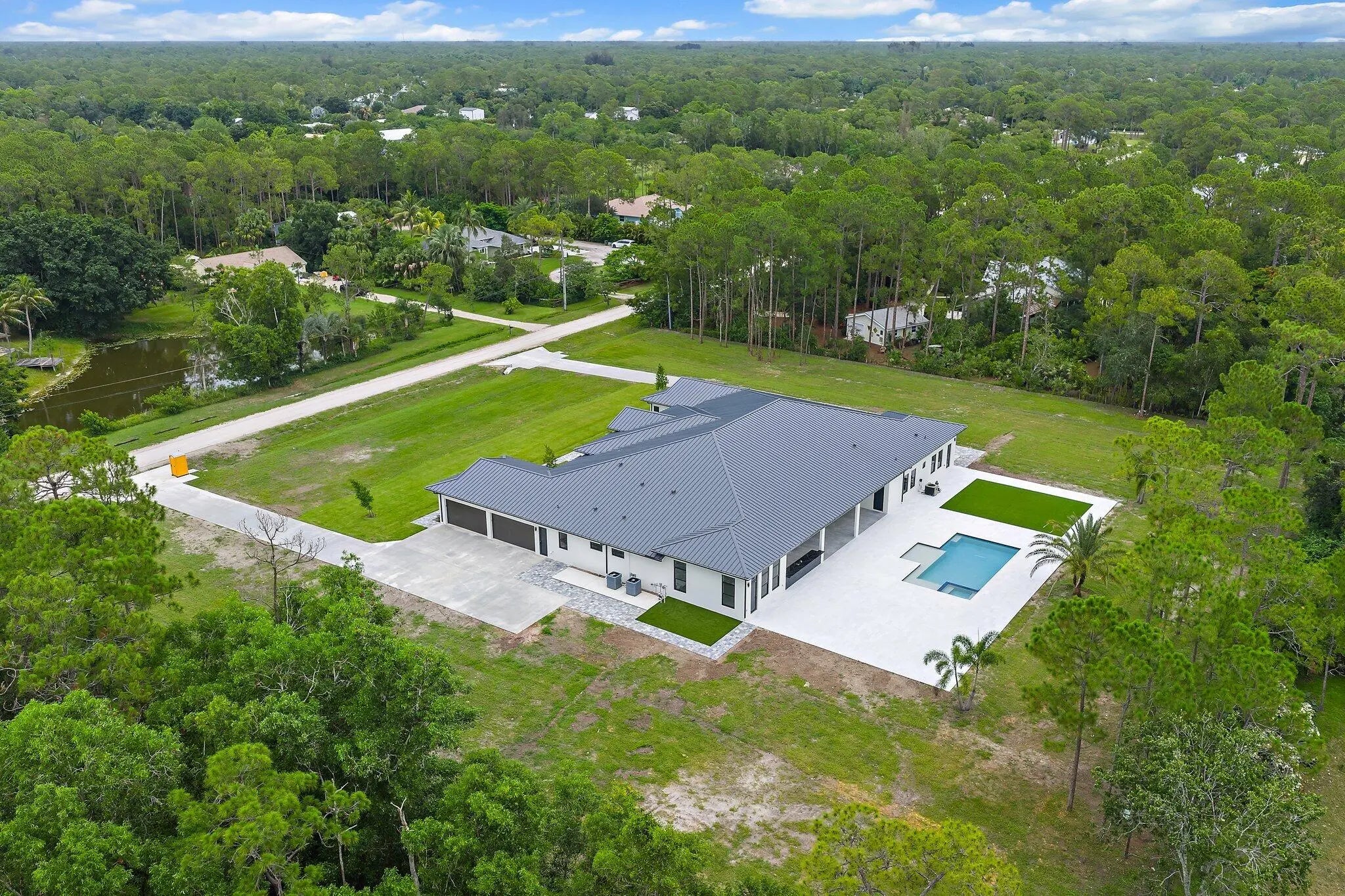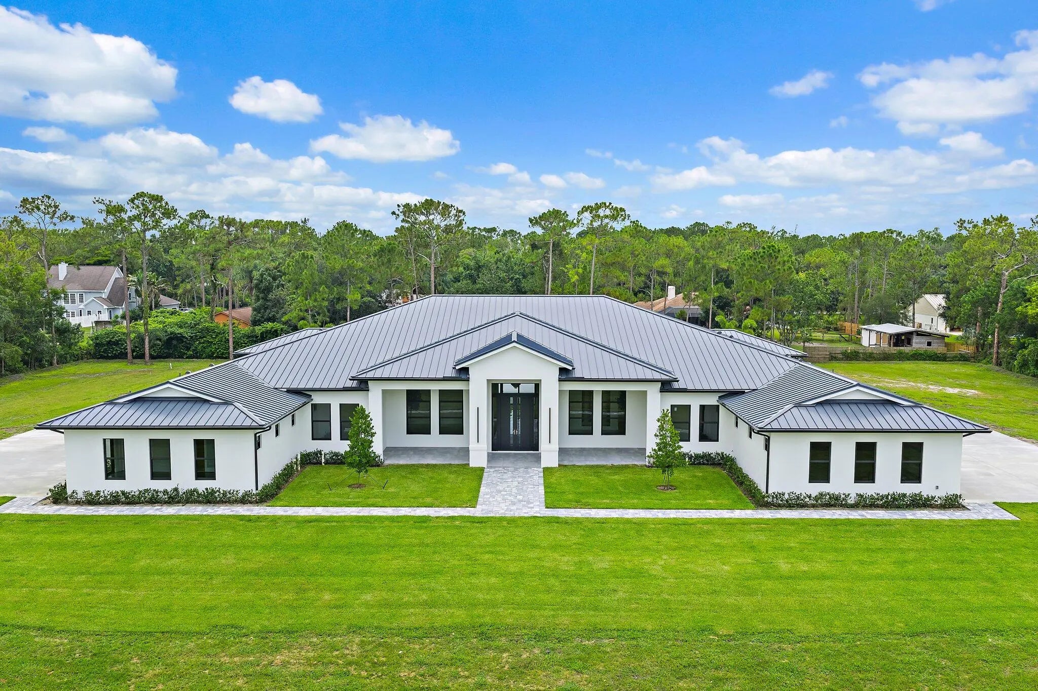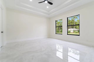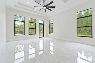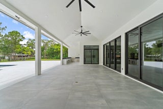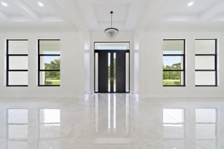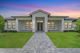 Brand-new 2025 luxury estate on 2.5 acres in Jupiter Farms. Offering 8,230 sq ft of living space + guest house, 6 bedrooms, 8 full & 2 half baths, and over 10,900 total sq ft under roof. Built with uncompromising quality: steel-reinforced CBS construction, impact glass, charcoal metal roof, and foam insulation. Interiors feature 48x48 marble-look tile, soaring 10-16 ft ceilings, custom closets, and level 5 finishes. Gourmet kitchen with dual refrigerators, double ovens, pot filler, wet bar, and 10' cabinetry. Resort-style pool with 6,250 sq ft marble deck, summer kitchen, sauna, gym, billiards, media room, and wine cellar. Guest house with full kitchen & living. Horses permitted, no HOA. A rare opportunity for modern luxury on acreage in Jupiter.