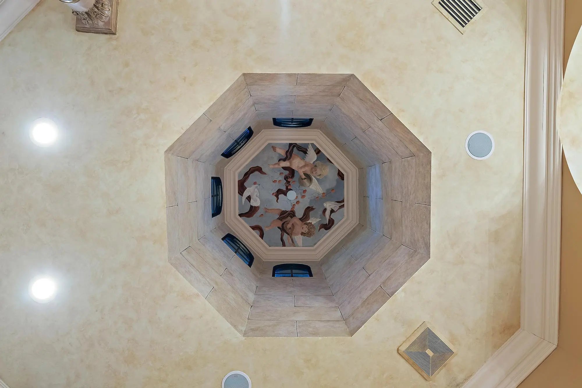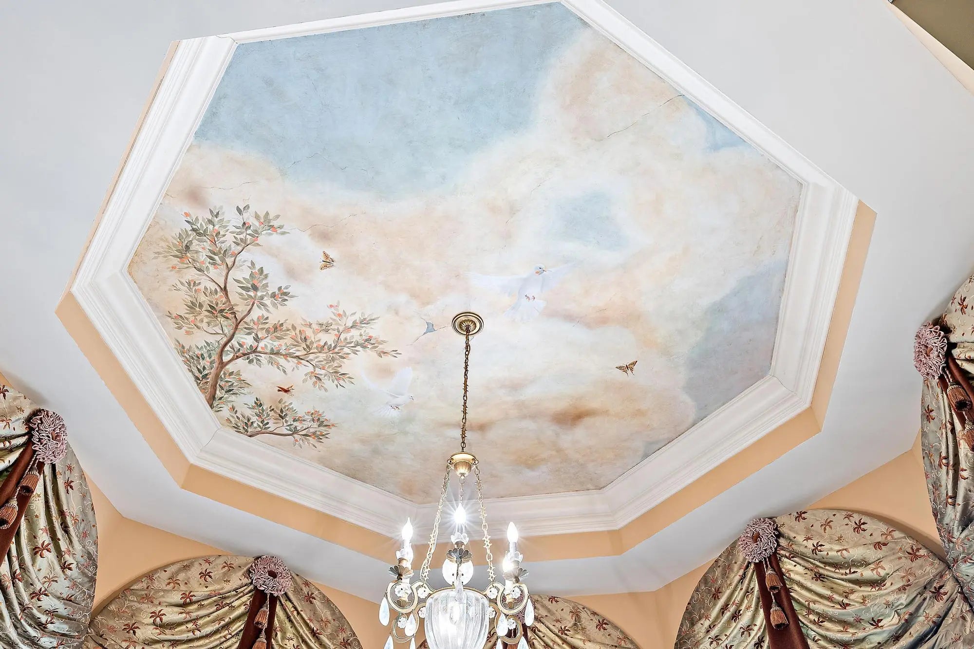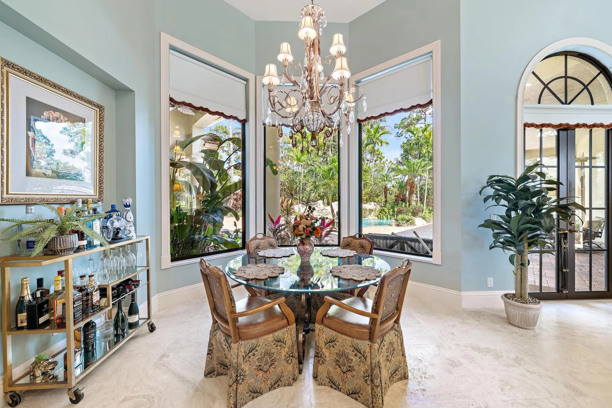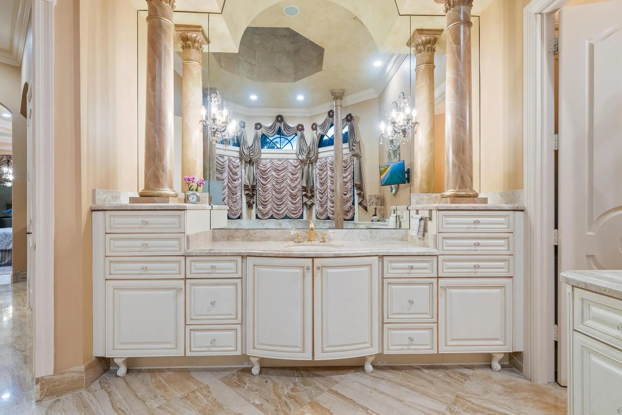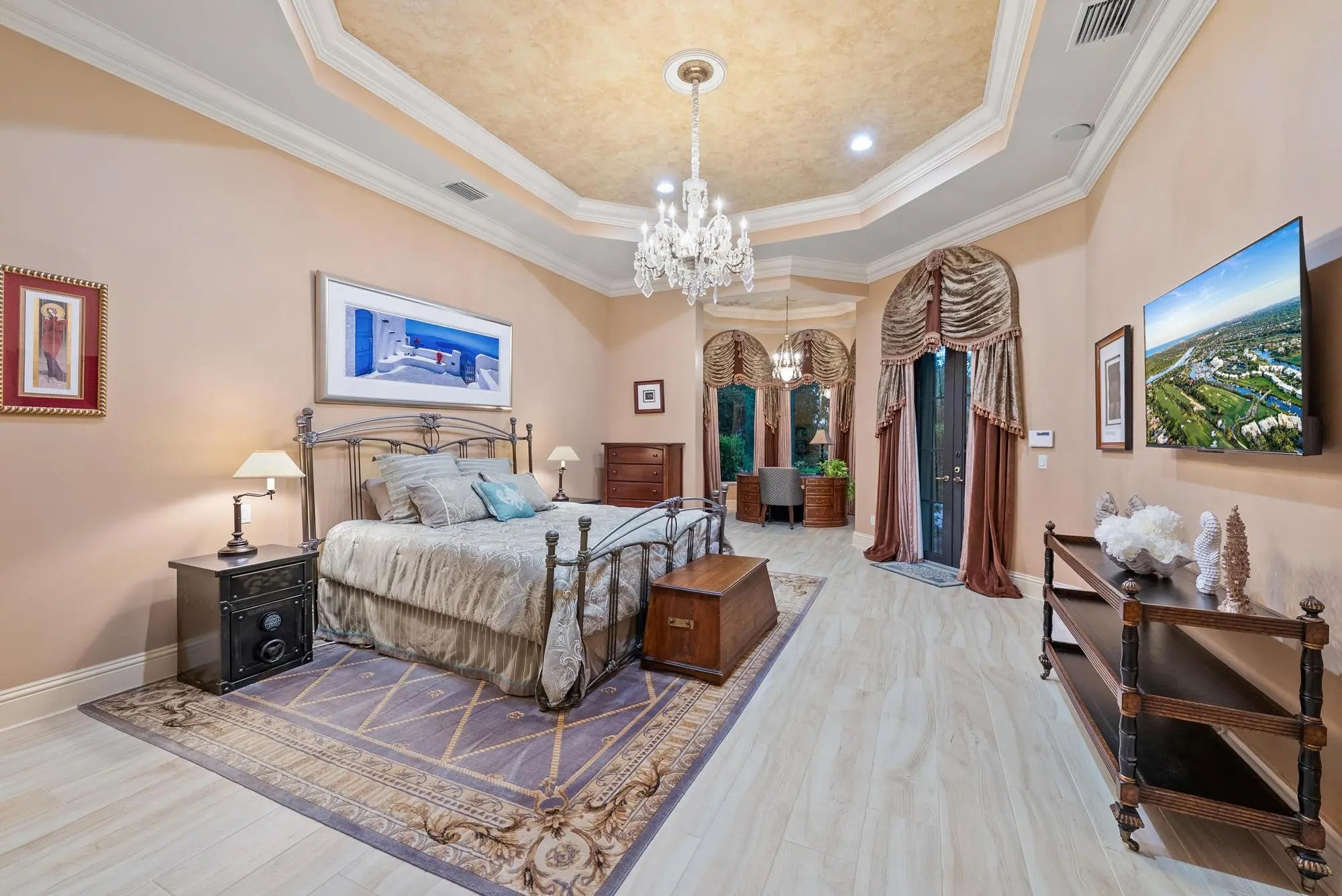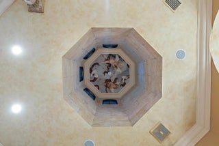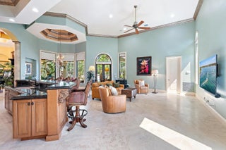 This extraordinary single-story estate in prestigious Bay Hill Estates offers the ultimate blend of timeless craftsmanship and modern convenience. Spanning over 5,400 square feet on a private one-acre lakefront lot, this residence is a showcase of artisan finishes, state-of-the-art upgrades, and resort-style amenities. From the moment you step into the grand foyer, graced with inlaid marble floors and soaring coffered ceilings, it is clear that every detail of this home has been designed with sophistication in mind. The living spaces are adorned with custom millwork, hand-selected marbles, solid wood cabinetry, and designer chandeliers, while a coral stone fireplace anchors the formal living room with warmth and elegance.