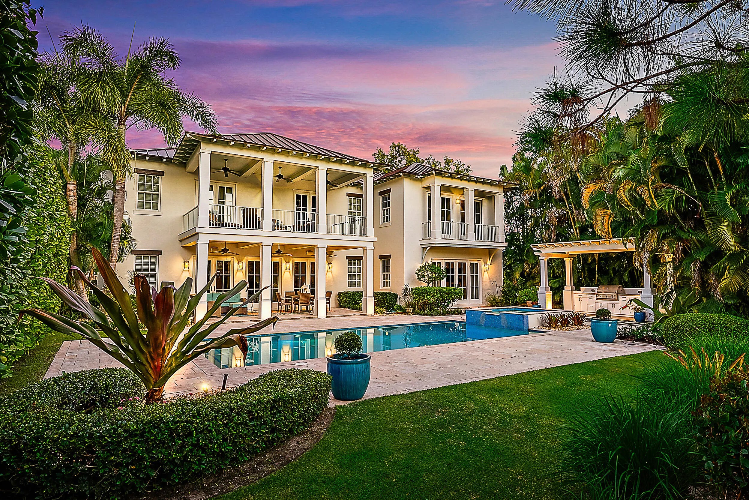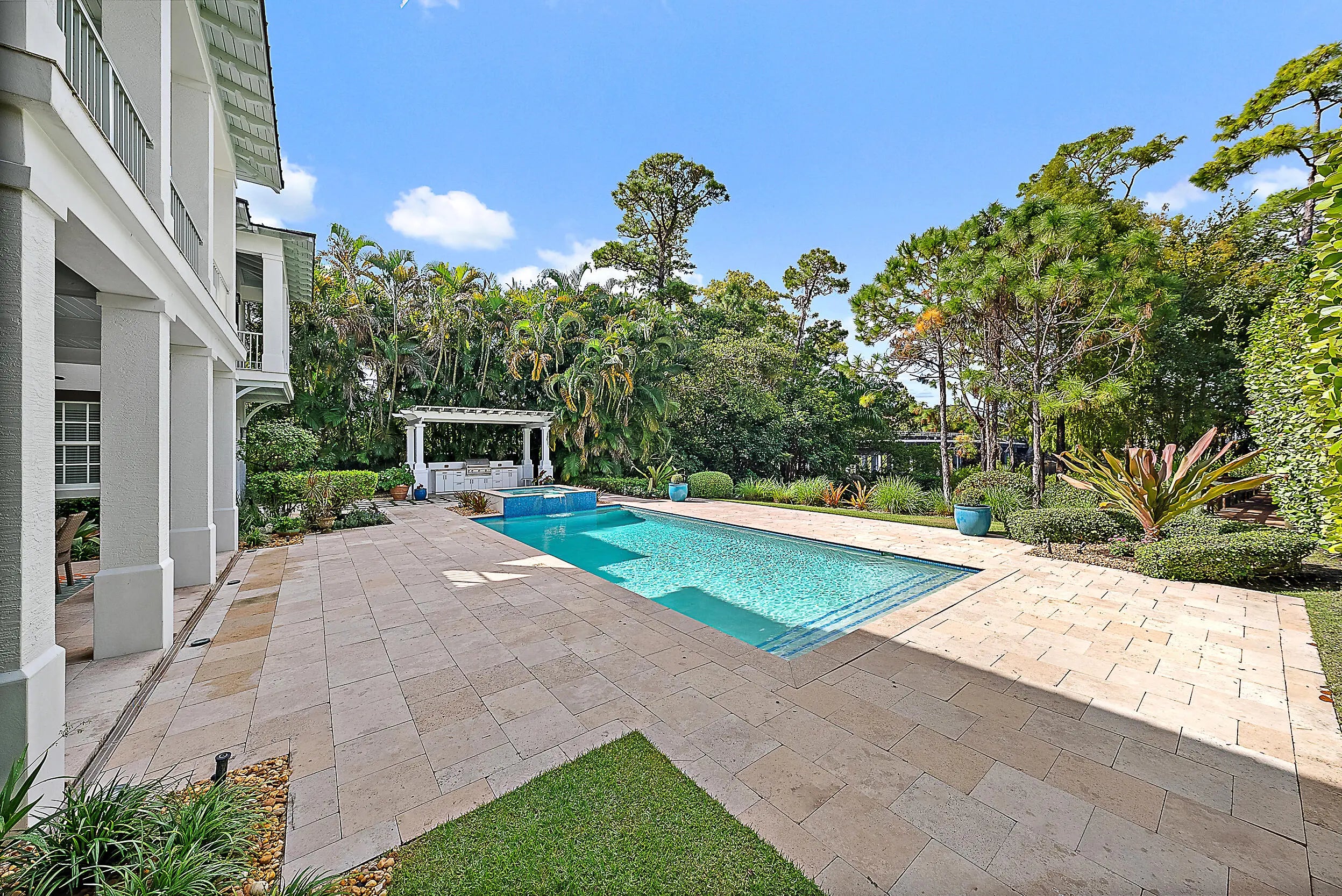 Discover elevated waterfront living in Old Cypress Point, a private gated enclave offering exceptional privacy. This British West Indies-inspired residence, built in 2012, features four ensuite bedrooms, four-and-a-half baths, thoughtfully designed for refined coastal living. Notable features include a 3 car garage, a full-house generator, impact windows and doors and sweeping waterviews. The outdoor setting rivals a luxury resort, showcasing a pool and spa, summer kitchen, private dock, and lush tropical landscaping creating a serene retreat. Inside, wide-plank wood floors highlight elegant living and dining spaces with a fireplace and French doors opening to covered patios. The chef's kitchen offers quartz countertops, an oversized island, and walk-in pantry. Don't miss this opportunity