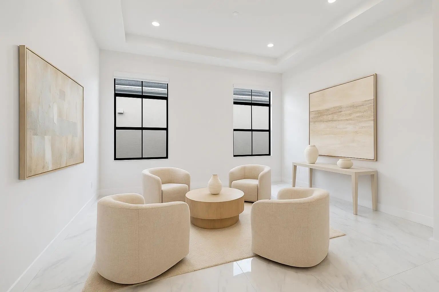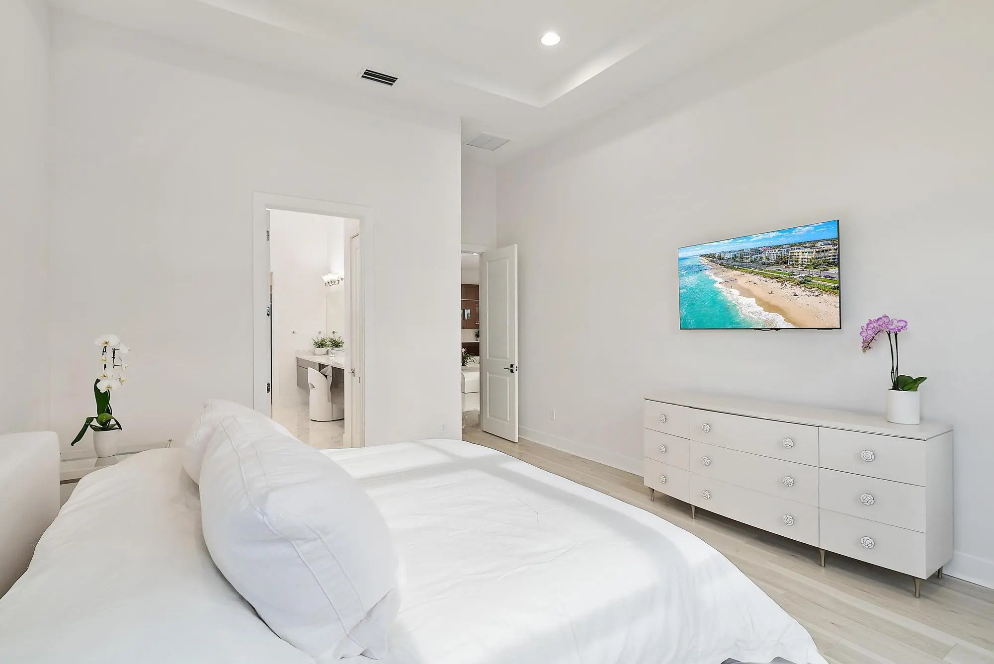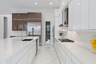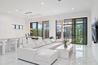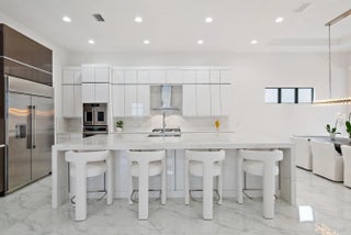 A sanctuary of balance and design, this one-level home spans over 3,000 SQ. FT. of living space with 3 bedrooms, 3.5 baths, and an oversized den or 4th bedroom. The grand foyer features 17-ft. ceilings, and 12 ft. throughout. Only one owner of this new construction home that closed in 2024. The kitchen's statement island anchors the space and the kitchen features a full quartz backsplash, acrylic touch-latch cabinetry, and GE Monogram appliances complemented by Restoration Hardware lighting. The serene primary suite features wood floors, a floating double vanity, soaking tub, walk-in shower, and views of the saltwater pool. California Closets and roller shades in all rooms; automatic shades in the master, great room and den. Outdoors, relax on the travertine patio with screen enclosure,