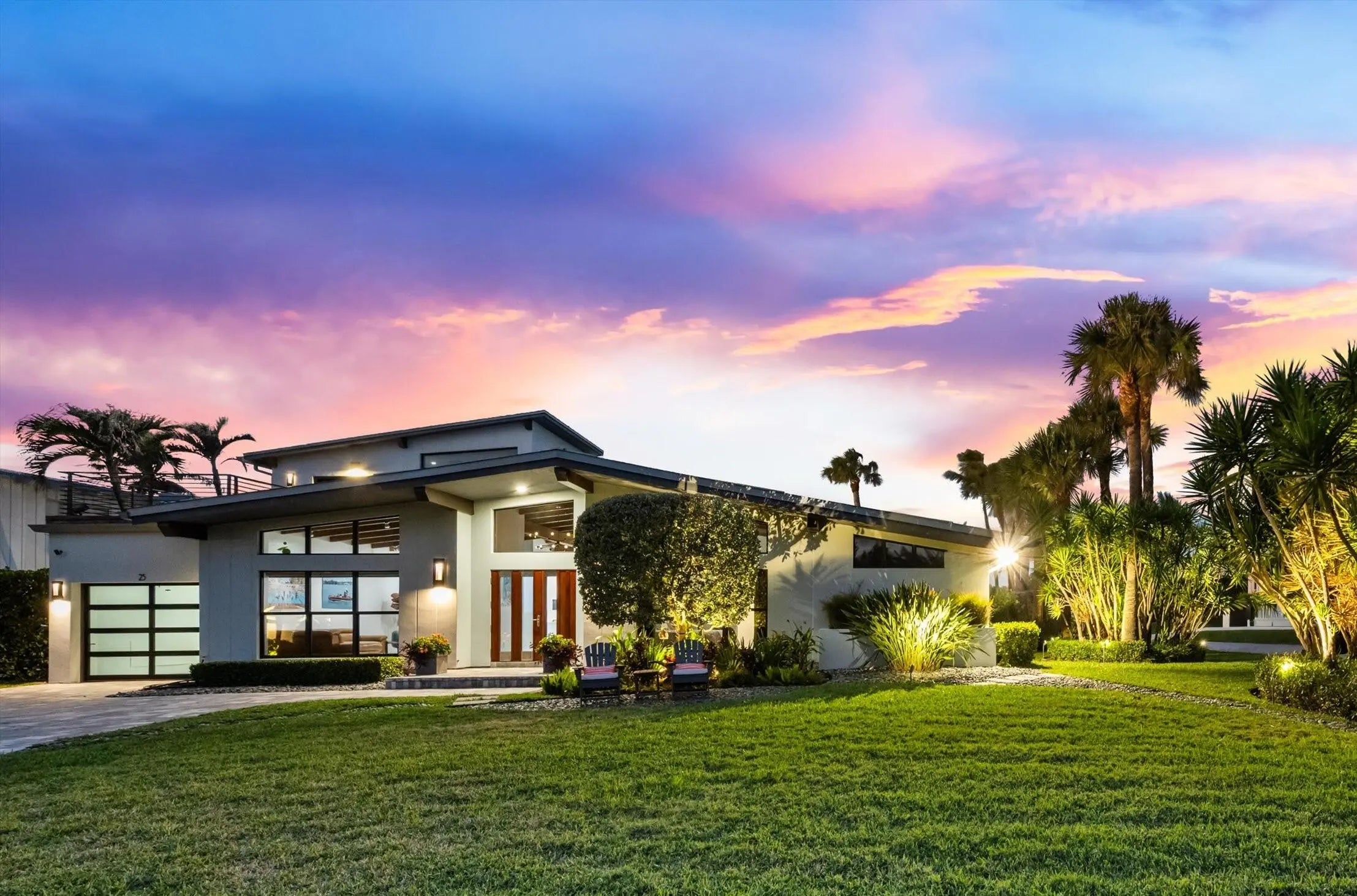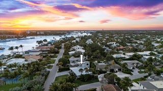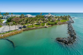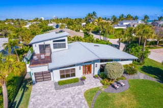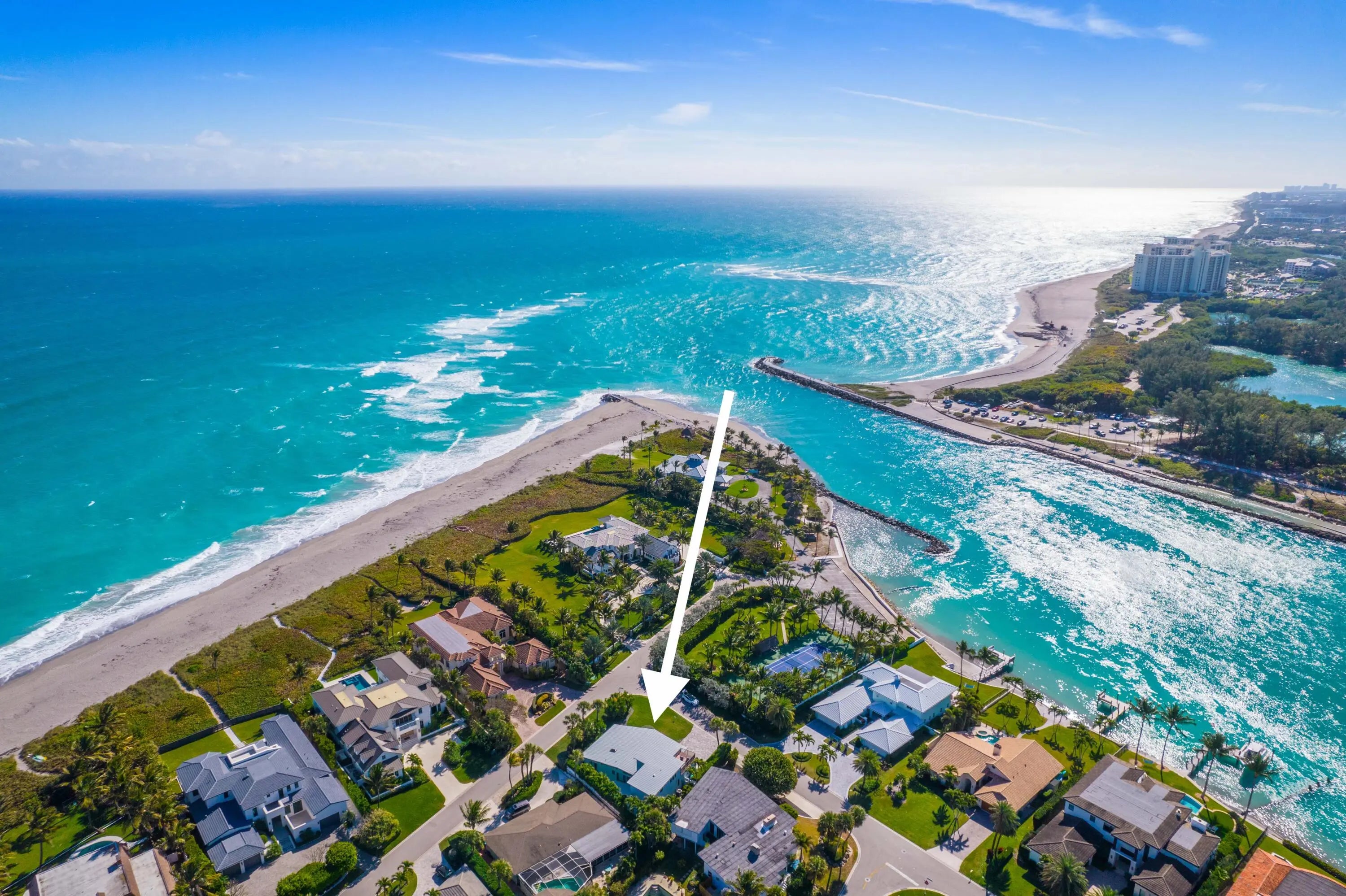 Located in the exclusive seaside community of Jupiter Inlet Colony, this rare midcentury modern home sits on a desirable interior corner lot at the southern tip of Jupiter Island, offering beautiful views of both the Atlantic Ocean and the Jupiter Inlet. Just steps from the community beach access and across from the private beach club, the setting delivers an effortless coastal lifestyle with exceptional privacy and security.The furnished three-bedroom, three-bath residence has been thoughtfully remodeled and meticulously maintained. Interior highlights include volume ceilings with exposed beams, impact windows and doors, custom lighting, Brazilian walnut and porcelain floors, and a modern kitchen equipped with Thermador appliances. The spacious primary suite features a large bedroom