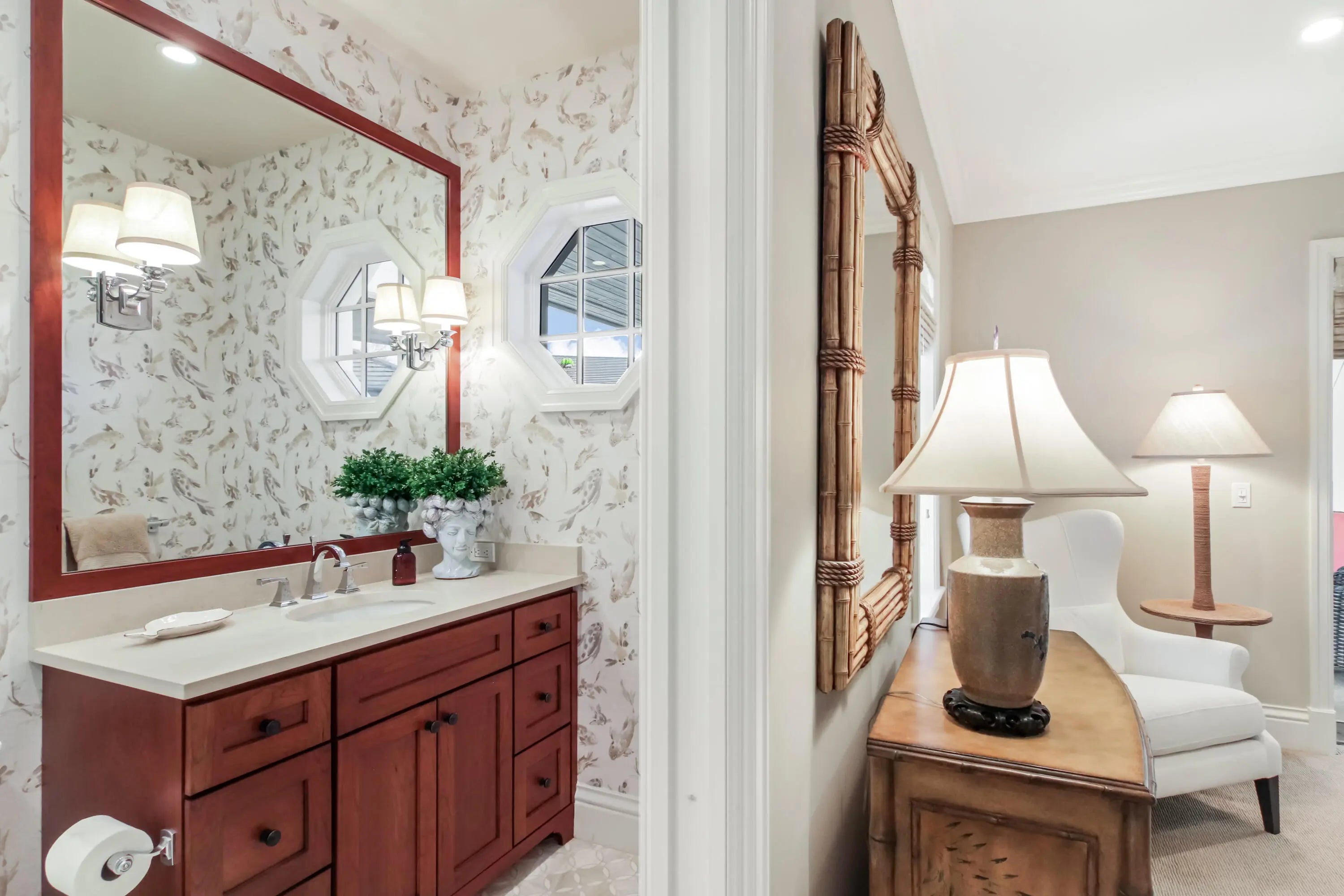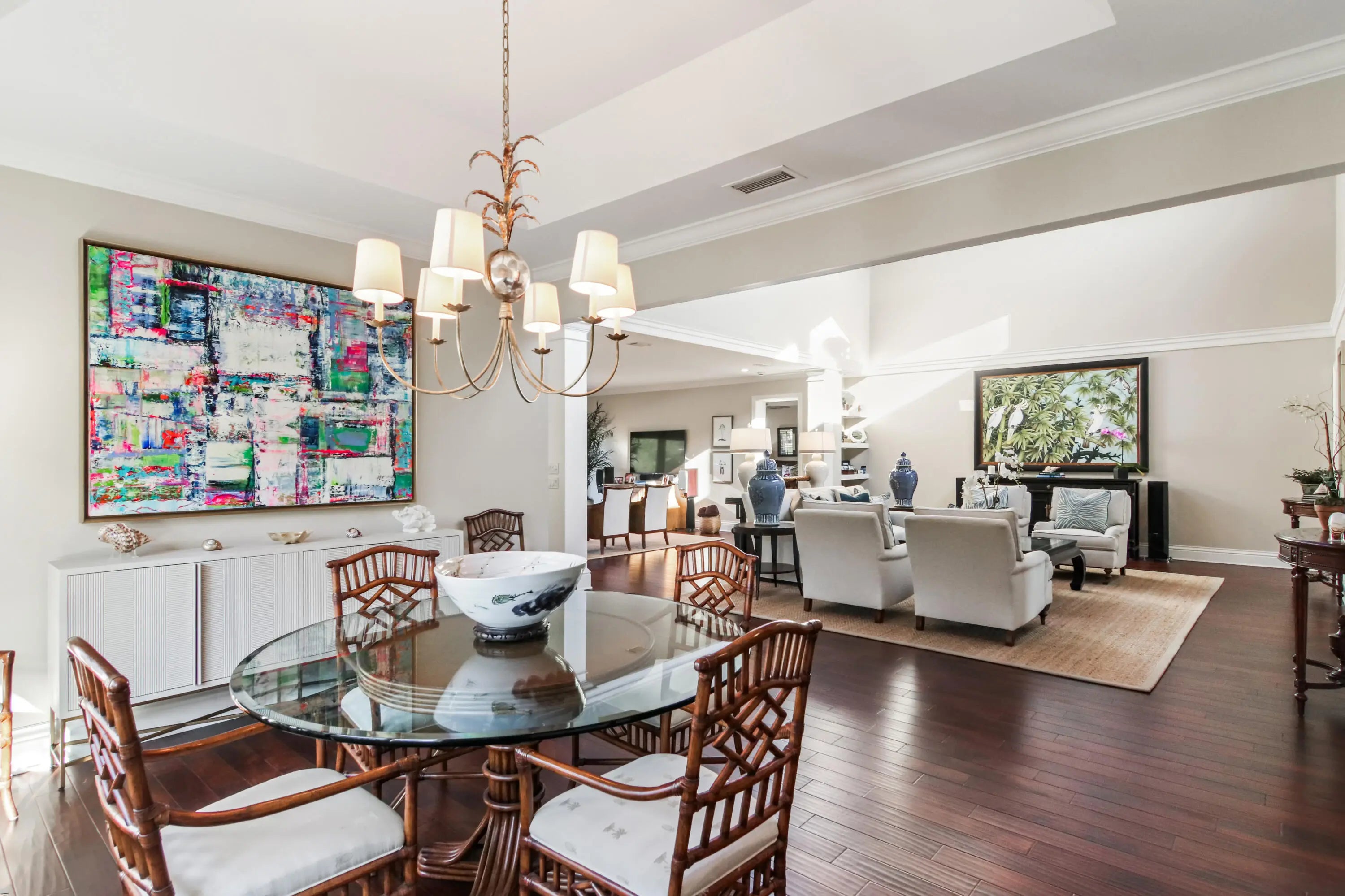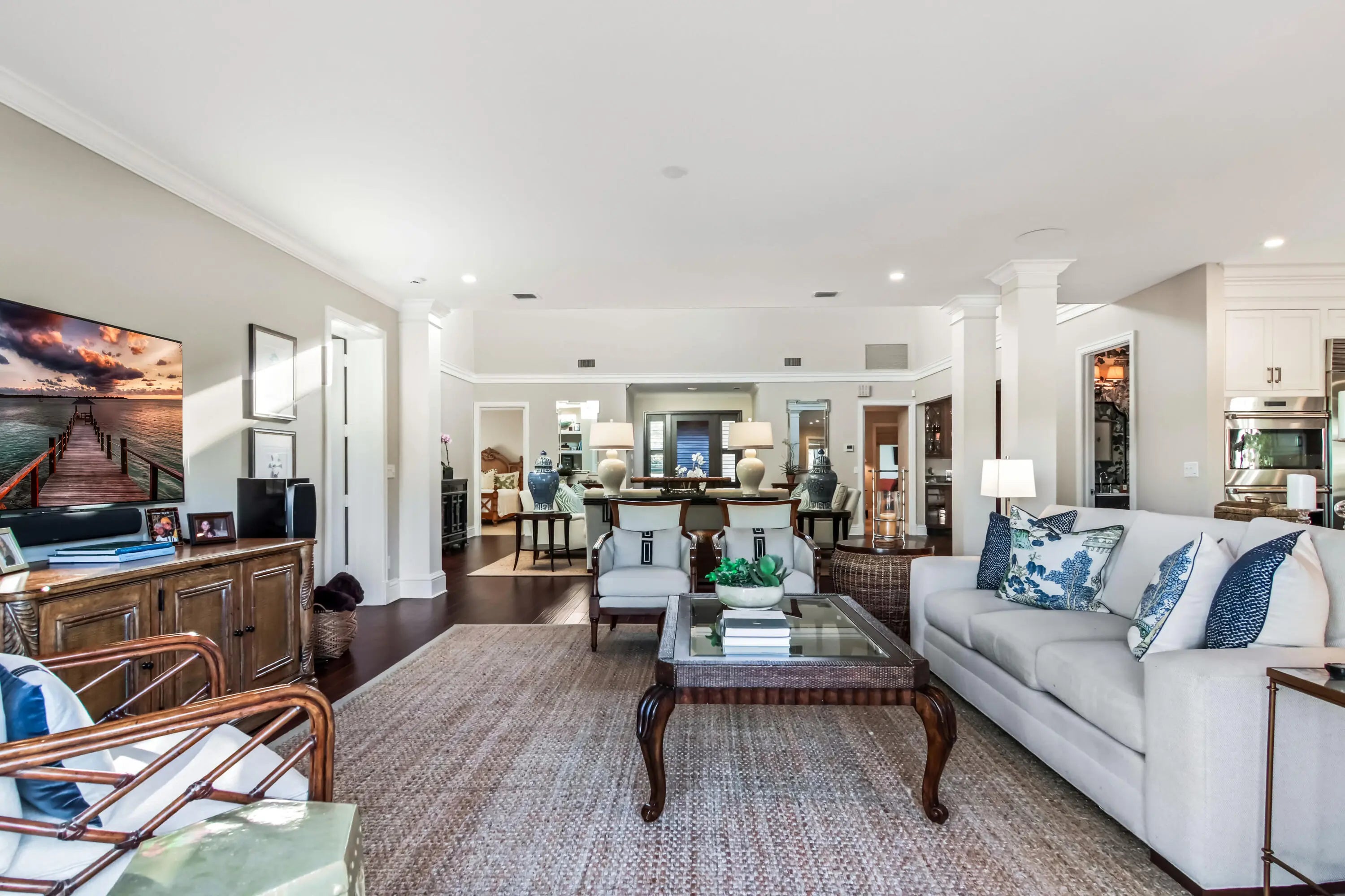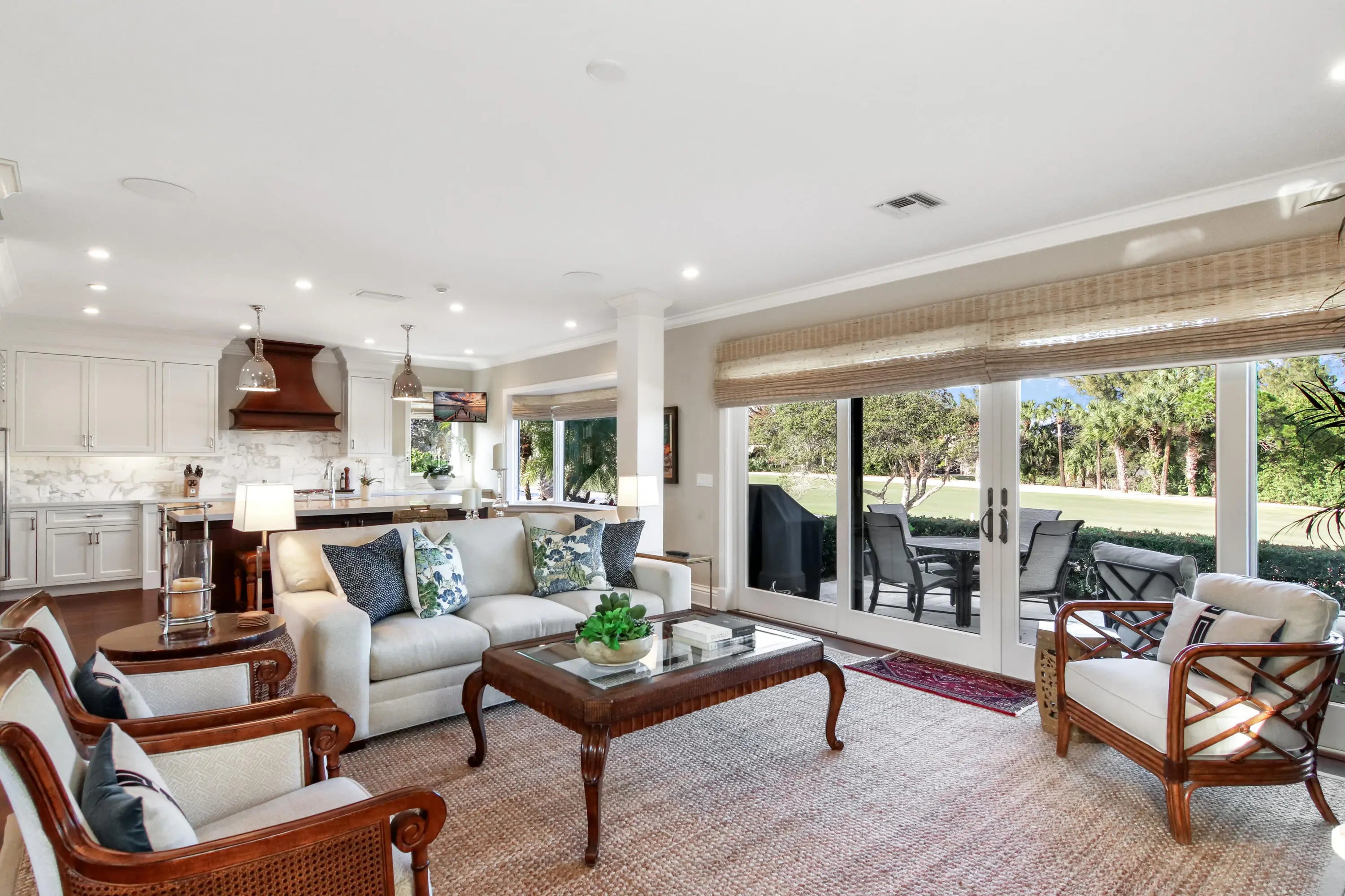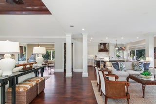 Upscale single-story estate located on the 16th hole of prestigious Jupiter Hills with sweeping fairway views. Fully renovated to the studs in 2015 by Ed Knight Contracting, this meticulously maintained residence offers exceptional quality and craftsmanship throughout. Featuring 3 spacious bedroom suites & 3.5 baths, the home is designed for comfort and privacy. The chef's kitchen by Waterview Kitchens includes custom cabinetry, premium finishes, high-end appliances, and a large center island, all opening to expansive living and dining areas ideal for entertaining. Designer interiors by Patrick Day Interiors showcase wood flooring, marble accents, soaring ceilings, and abundant natural light. Large windows frame beautiful golf course views. Seamless indoor-outdoor living